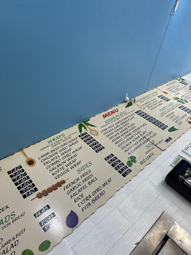 The Mediterranean Combination plate inlcudes:2 skewers, 1 chicen 1 beef1 kofte patty lamb&Beef Gyro meat Rice, Salad and pita.